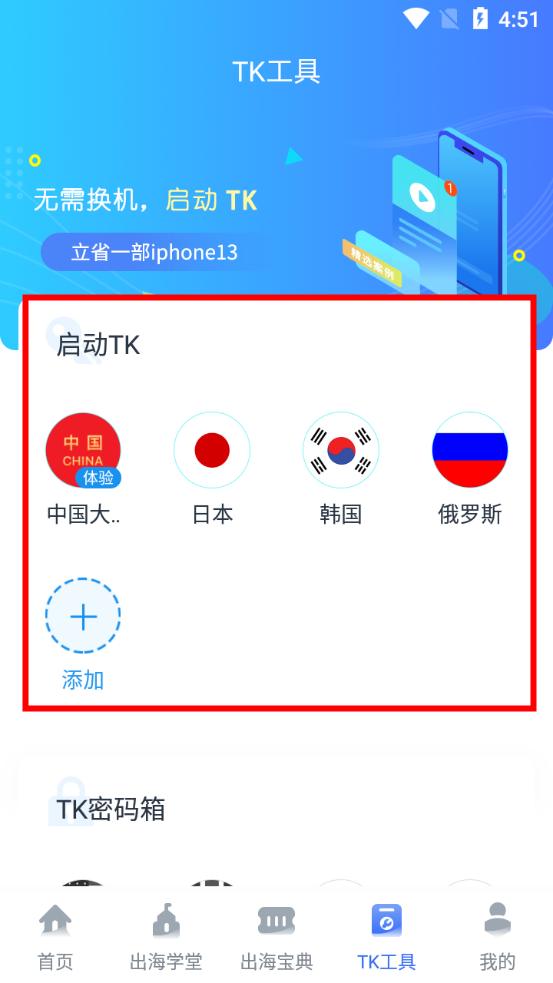 打开TK运营助手,在启动 TikTok这一块区域,选择一个你想观看的地区并点击。